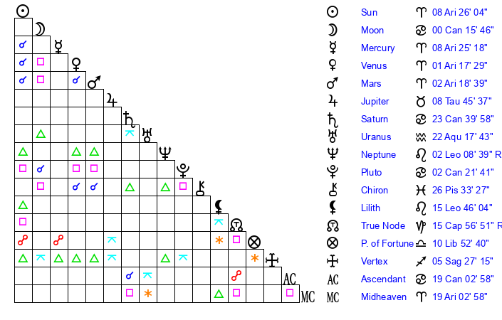 | Mars | 2 Aries 19 | 22 Cancer 52 | 21 Gemini 33 |
