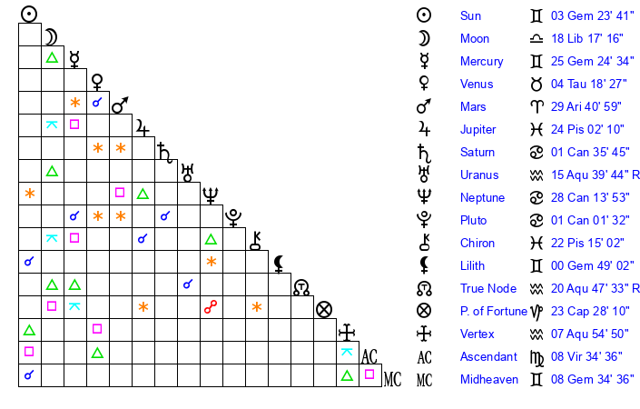 | Sun | 3 Gemini 23 | 4 Gemini 44 | 18 Virgo 50 |