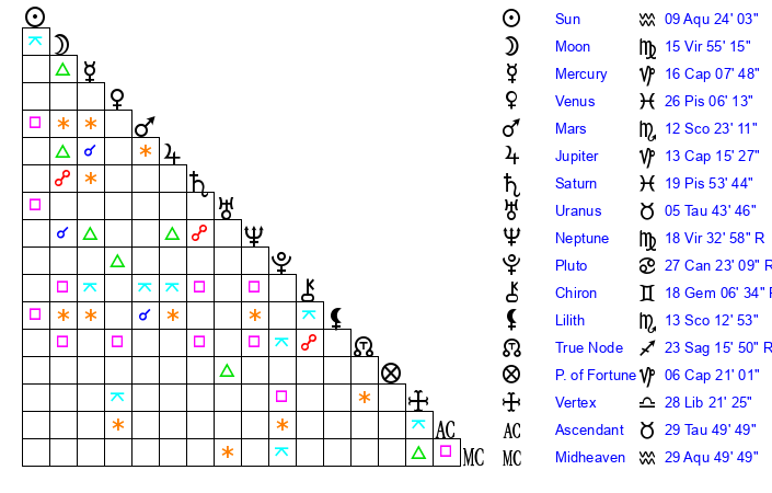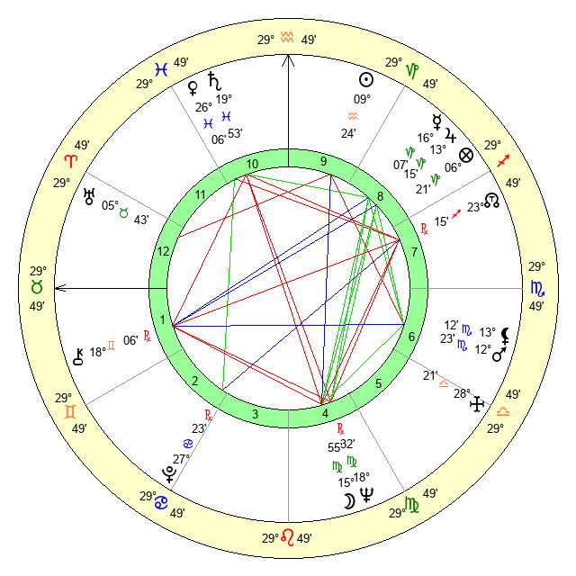 | Moon | 15 Virgo 55 | 12 Aquarius 20 | 29 Scorpio 24 |