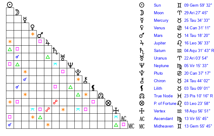 | Moon | 29 Aries 23 | 11 Leo 44 | 20 Virgo 39 |