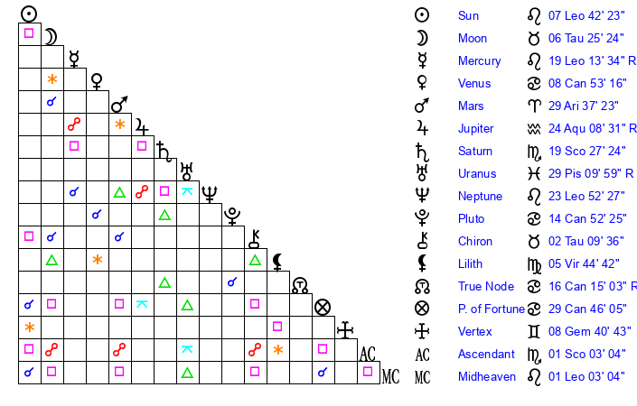 | Mercury | 19 Leo 13 | 9 Leo 12 | 7 Sagittarius 34 |