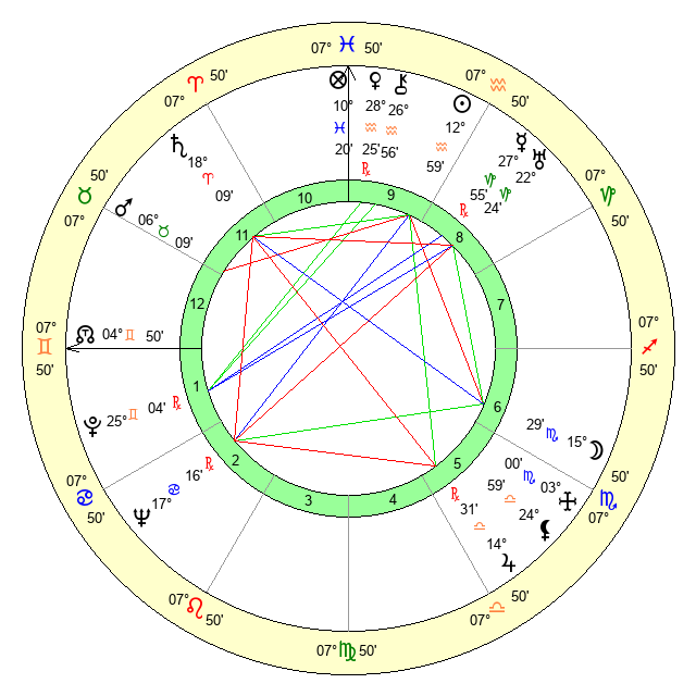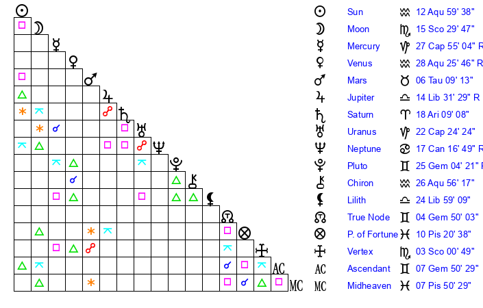 | Sun | 13 Aquarius 0 | 14 Aquarius 6 | 6 Gemini 28 |
