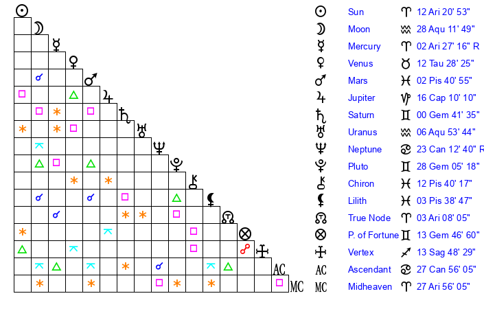 Moon | 28 Aquarius 8 | 12 Gemini 27 | 0 Aries 22 |