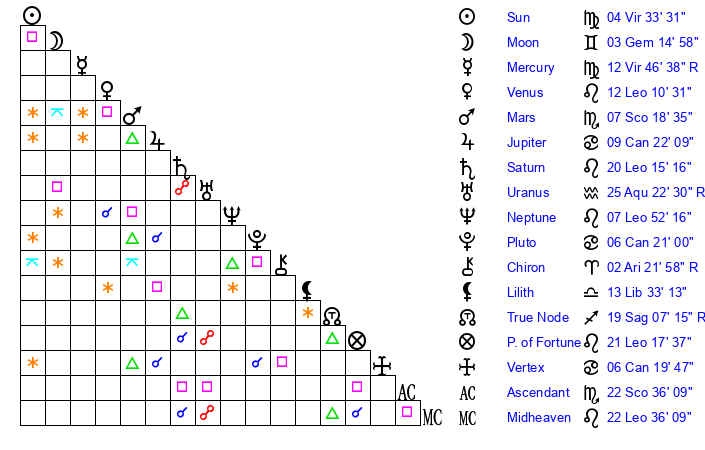 | Mercury | 12 Virgo 46 | 21 Leo 4 | 1 Capricorn 51 |