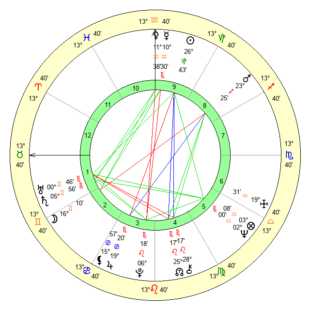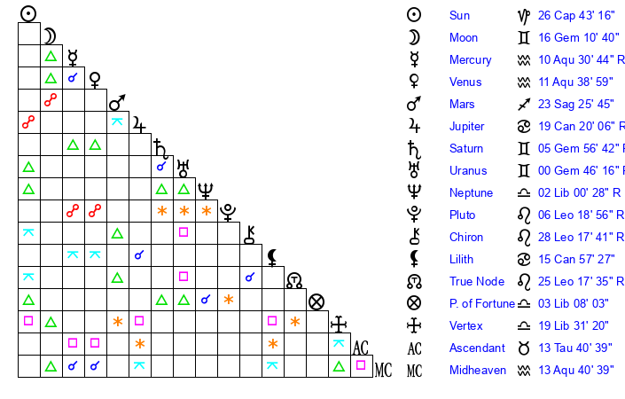 | Moon | 16 Gemini 9 | 12 Virgo 30 | 16 Gemini 50 |
