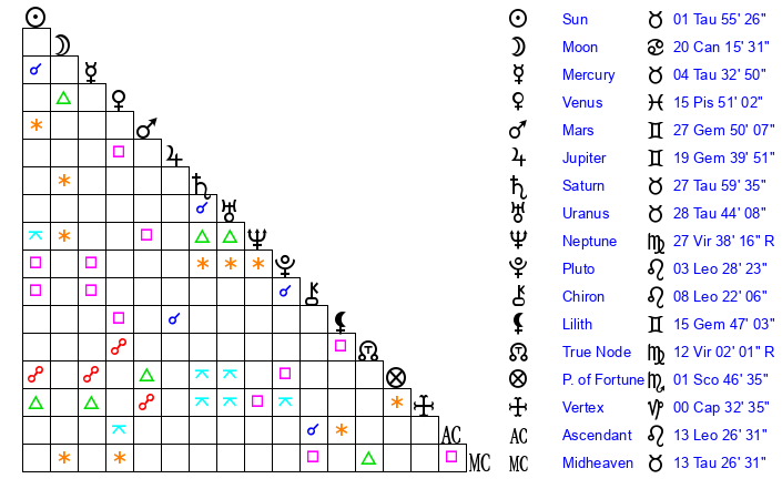 | Saturn | 28 Taurus 13 | 26 Pisces 53 | 8 Gemini 30 |