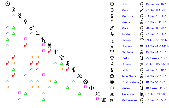 | Sun | 15 Leo 42 | 16 Leo 24 | 11 Sagittarius 10 |