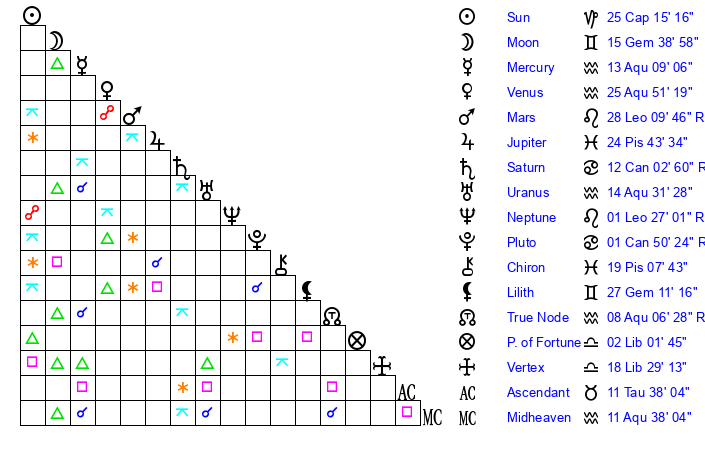 | Venus | 25 Aquarius 51 | 13 Pisces 50 | 28 Gemini 59 |
