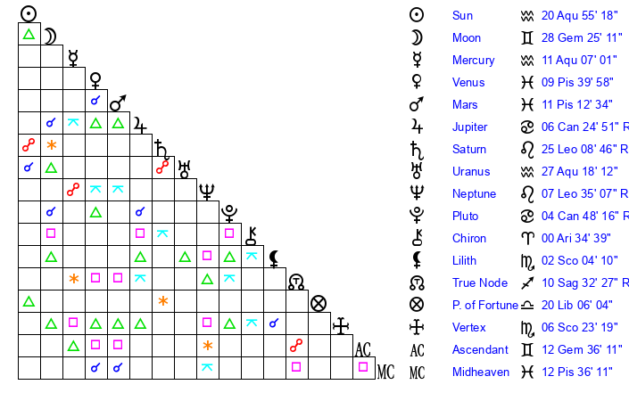 | Sun | 20 Aquarius 55 | 22 Aquarius 12 | 5 Gemini 20 |