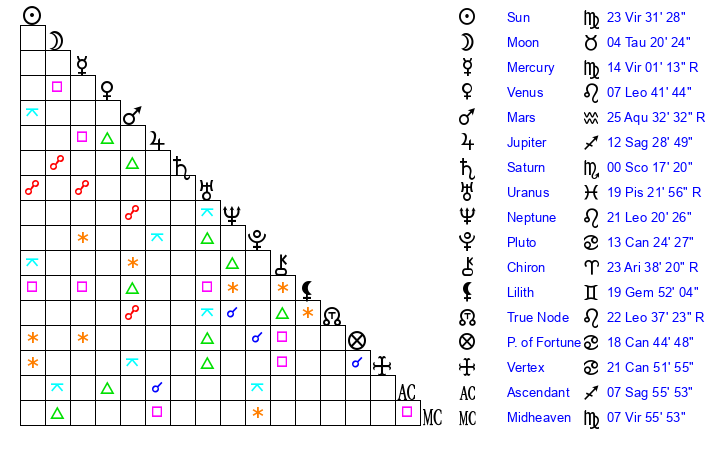 | Sun | 23 Virgo 32 | 24 Virgo 5 | 4 Capricorn 41 |