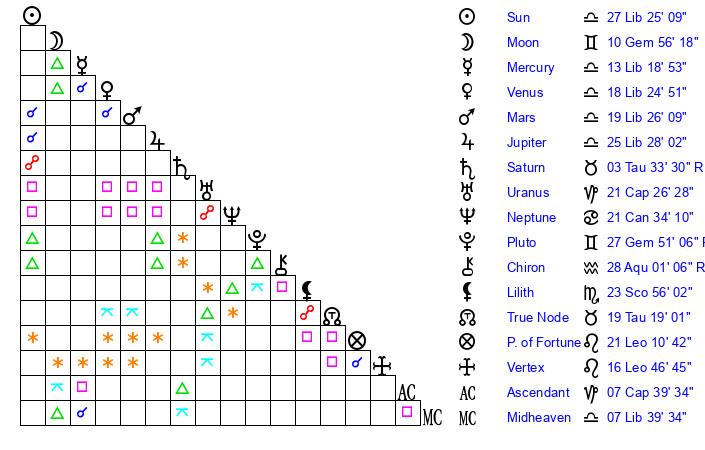 | Moon | 10 Gemini 42 | 0 Scorpio 35 | 27 Leo 21 |
