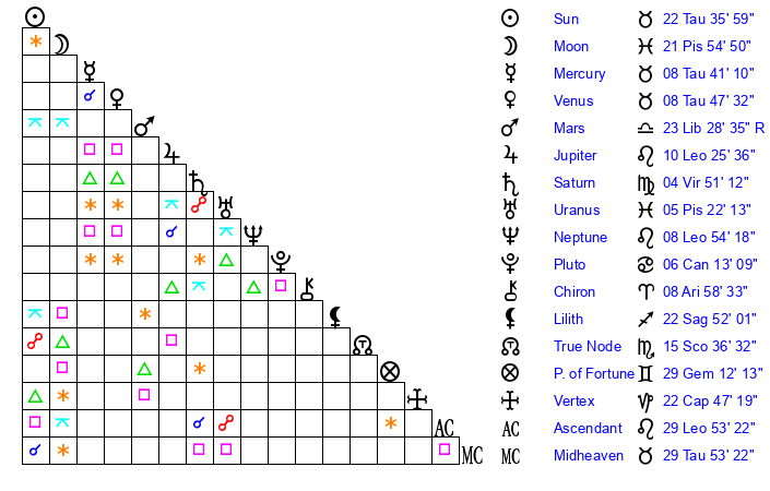 | Uranus | 5 Pisces 20 | 27 Taurus 4 | 3 Pisces 41 |