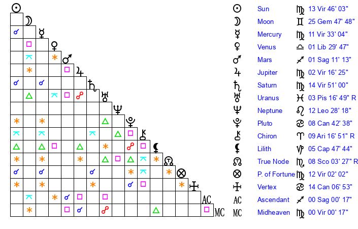 | Mercury | 11 Virgo 34 | 8 Virgo 1 | 13 Sagittarius 39 |