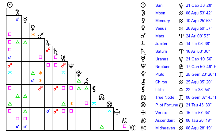 | Saturn | 17 Aries 26 | 15 Pisces 26 | 29 Aries 20 |