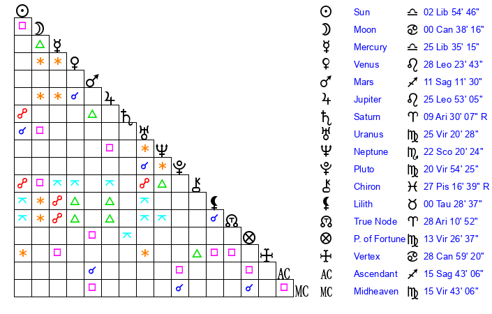 Sun | 2 Libra 55 | 3 Libra 51 | 0 Sagittarius 43 |