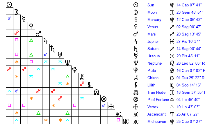 | Moon | 23 Gemini 53 | 28 Pisces 47 | 2 Capricorn 52 |