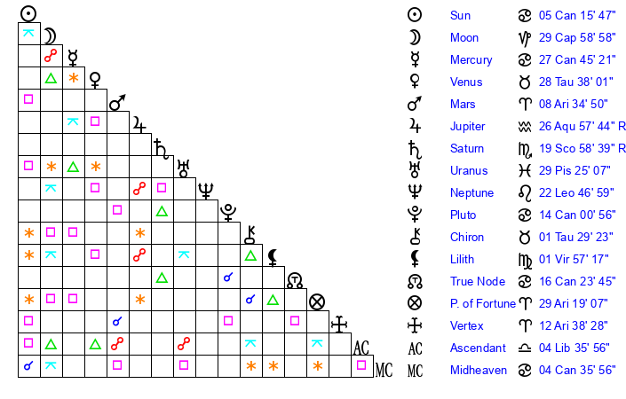 | Saturn | 20 Scorpio 30 | 1 Aries 37 | 23 Scorpio 45 |