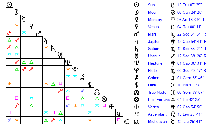 | Saturn | 13 Scorpio 17 | 28 Pisces 12 | 10 Scorpio 40 |