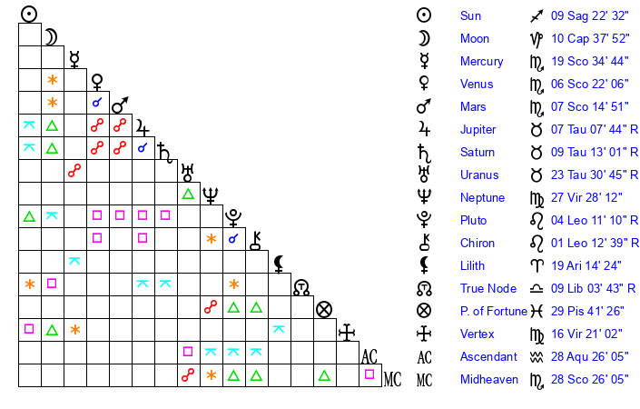 | Venus | 6 Scorpio 22 | 1 Sagittarius 5 | 22 Aquarius 14 |