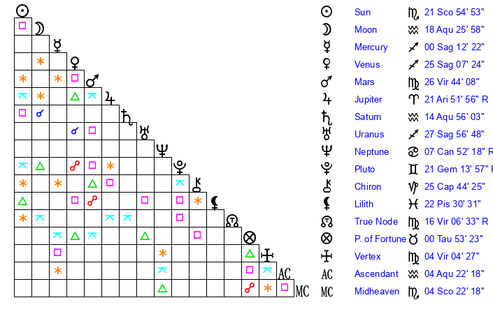 | Moon | 18 Aquarius 36 | 21 Virgo 26 | 10 Cancer 30 |