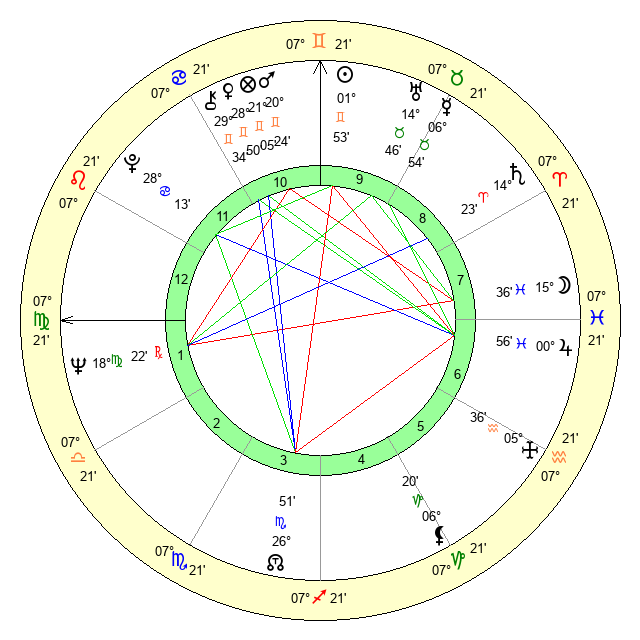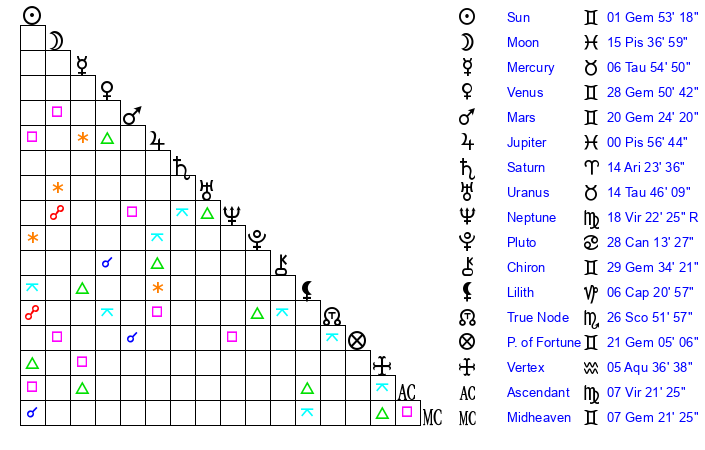 | Jupiter | 0 Pisces 52 | 26 Gemini 10 | 27 Aquarius 30 |