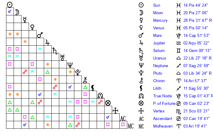Saturn | 14 Gemini 18 | 21 Pisces 10 | 18 Gemini 16 |