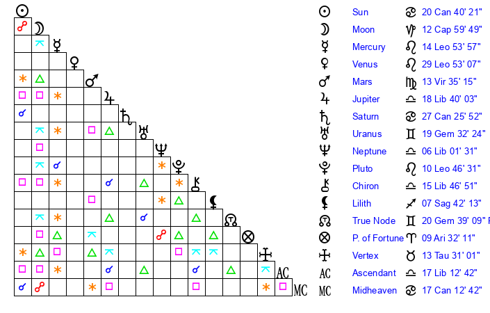 | Moon | 13 Capricorn 6 | 26 Aquarius 16 | 7 Sagittarius 44 |