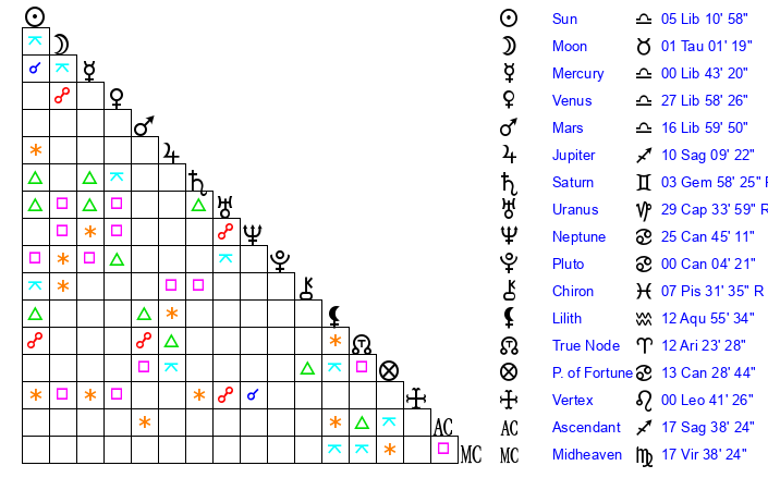 Sun | 5 Libra 11 | 5 Libra 49 | 29 Capricorn 3 |