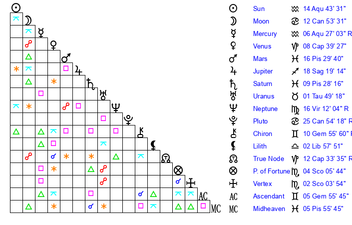 | Sun | 14 Aquarius 43 | 16 Aquarius 8 | 13 Taurus 3 |
