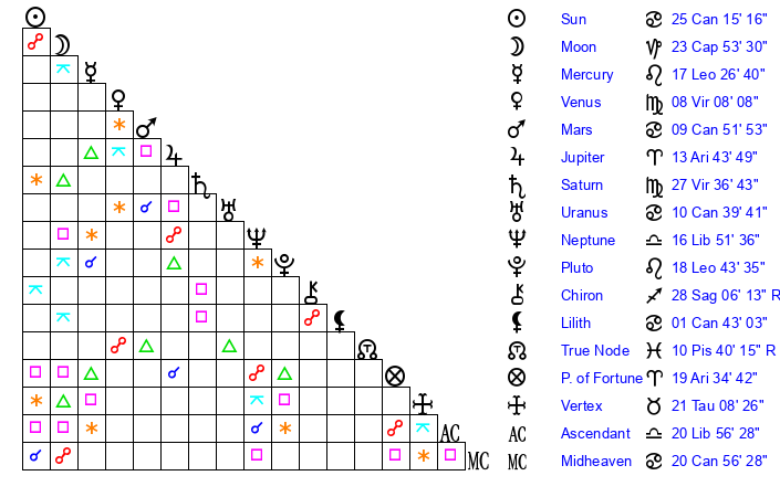 | Sun | 25 Cancer 15 | 26 Cancer 19 | 6 Libra 43 |