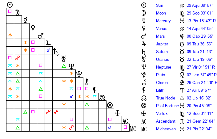 | Sun | 29 Aquarius 40 | 0 Pisces 17 | 22 Taurus 31 |