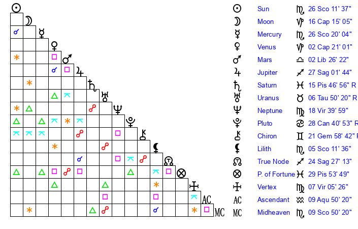 | Sun | 26 Scorpio 11 | 26 Scorpio 36 | 26 Aquarius 37 |