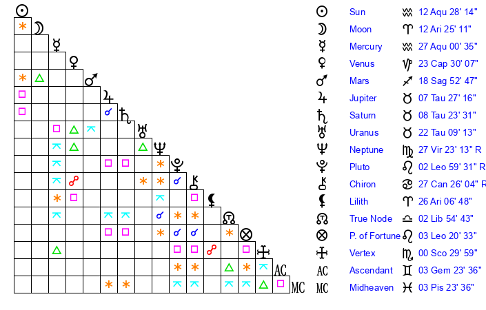 | Sun | 12 Aquarius 28 | 13 Aquarius 5 | 6 Taurus 3 |