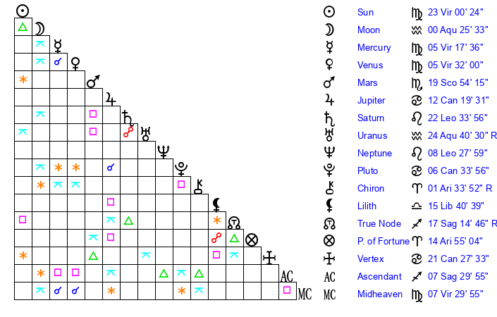 | Sun | 23 Virgo 0 | 24 Virgo 5 | 10 Capricorn 15 |
