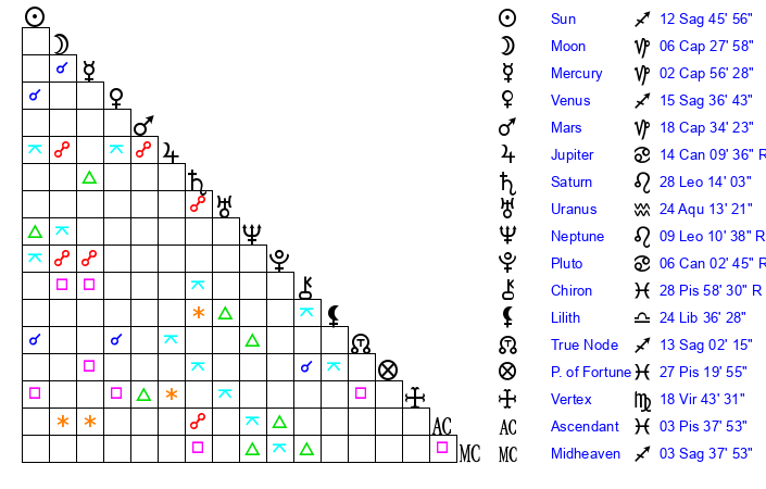 | Venus | 15 Sagittarius 37 | 28 Capricorn 12 | 27 Aries 51 |