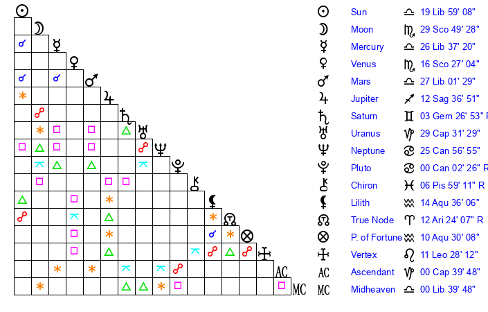 Moon | 29 Scorpio 54 | 19 Cancer 52 | 16 Capricorn 39 |