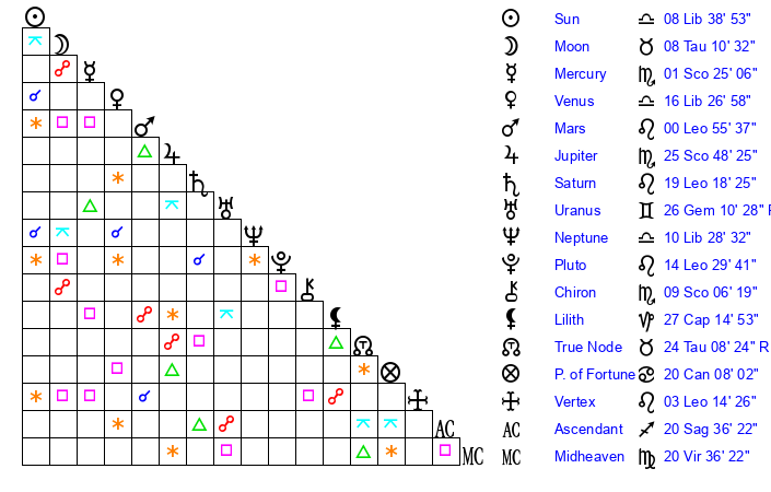 | Moon | 8 Taurus 10 | 11 Aquarius 25 | 15 Pisces 28 |
