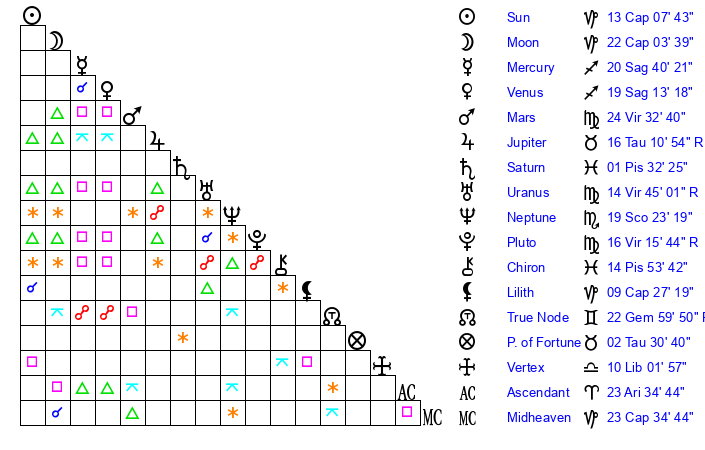| Moon | 22 Capricorn 4 | 0 Pisces 52 | 29 Pisces 8 |