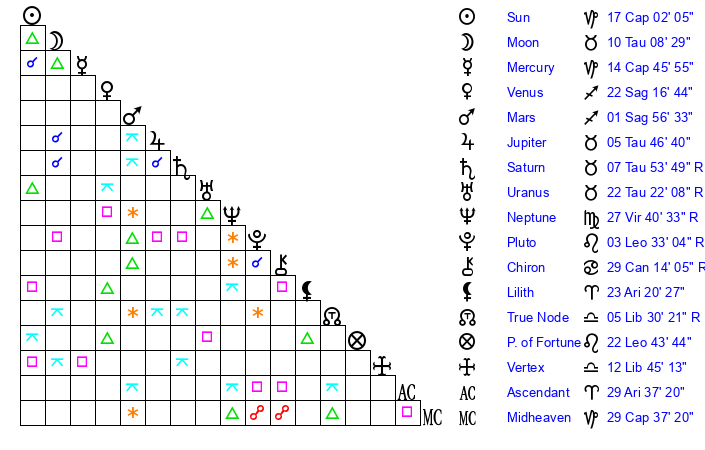 | Moon | 10 Taurus 6 | 27 Aries 1 | 4 Gemini 20 |