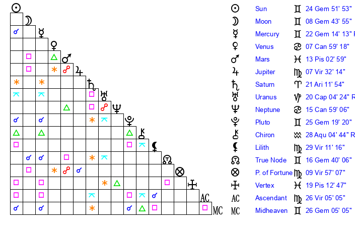 | Pluto | 25 Gemini 19 | 3 Aquarius 24 | 26 Gemini 51 |