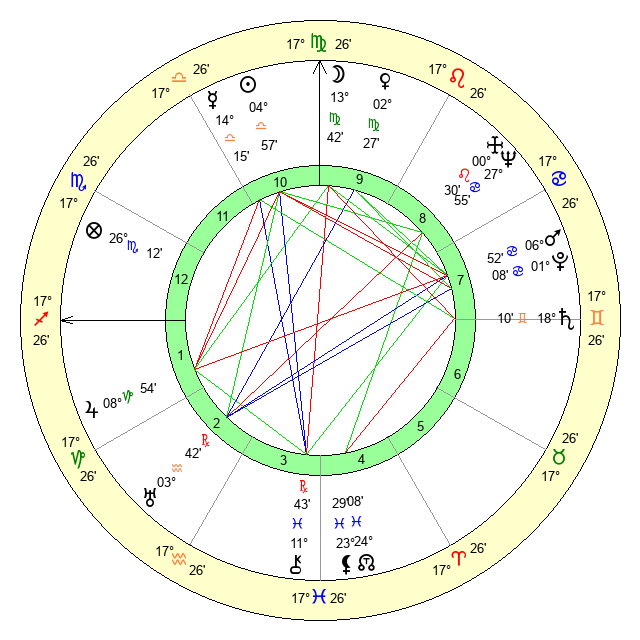 | Moon | 13 Virgo 43 | 21 Sagittarius 31 | 23 Libra 37 |
