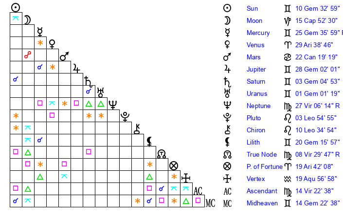 | Mercury | 25 Gemini 36 | 14 Gemini 36 | 18 Virgo 24 |