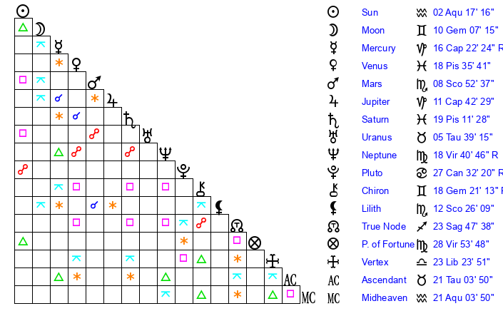 | Sun | 2 Aquarius 17 | 2 Aquarius 56 | 0 Taurus 11 |