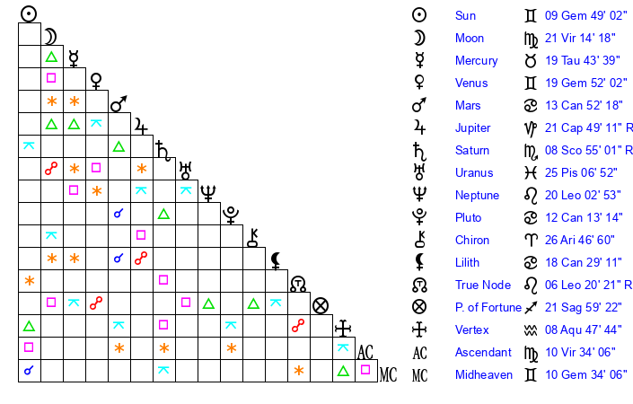 | Sun | 9 Gemini 49 | 10 Gemini 37 | 15 Virgo 38 |