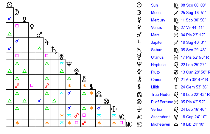 | Saturn | 6 Scorpio 1 | 25 Pisces 42 | 14 Scorpio 43 |