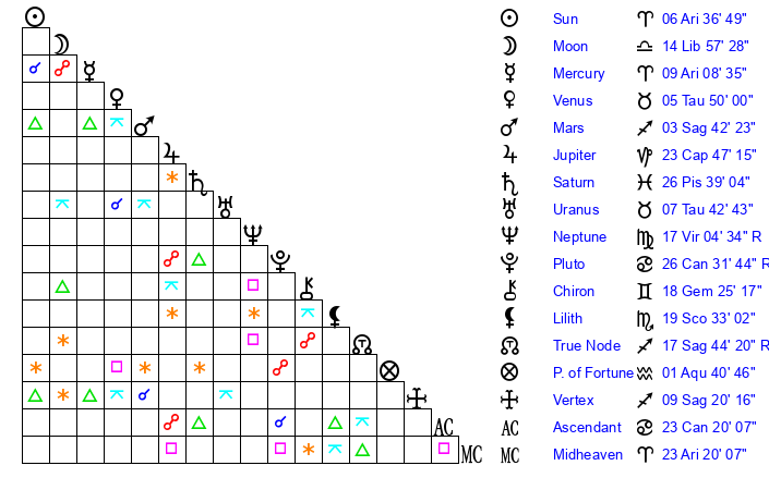 | Moon | 14 Libra 51 | 12 Pisces 58 | 29 Sagittarius 5 |