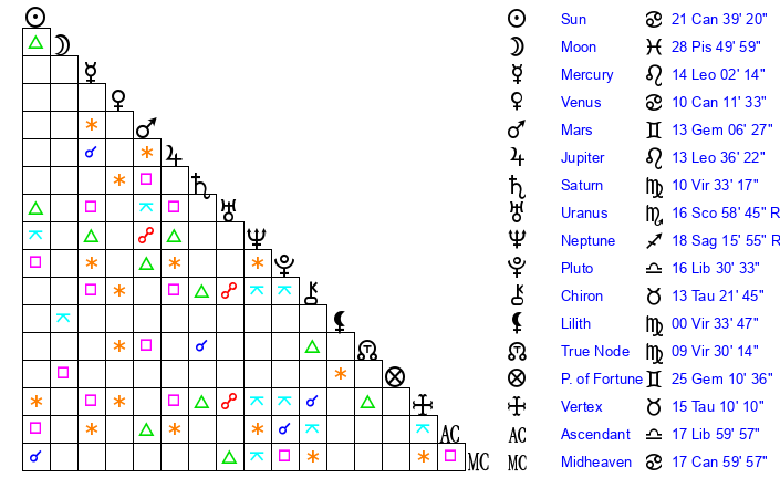 Venus | 10 Cancer 12 | 11 Gemini 13 | 6 Virgo 55 |
