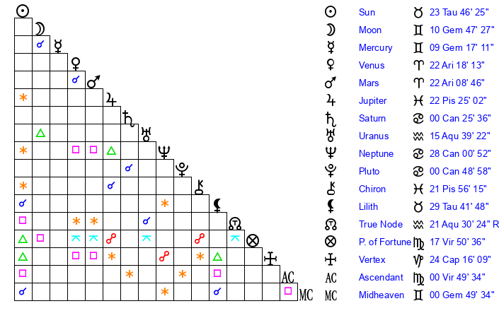 | Moon | 10 Gemini 47 | 28 Sagittarius 30 | 21 Gemini 0 |