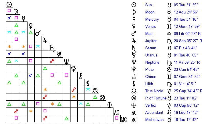 | Sun | 5 Taurus 31 | 6 Taurus 43 | 1 Leo 48 |