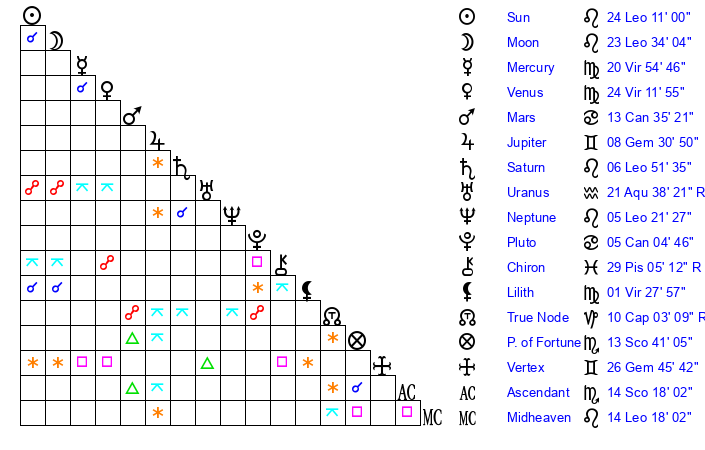 | Moon | 23 Leo 33 | 14 Gemini 37 | 9 Leo 25 |